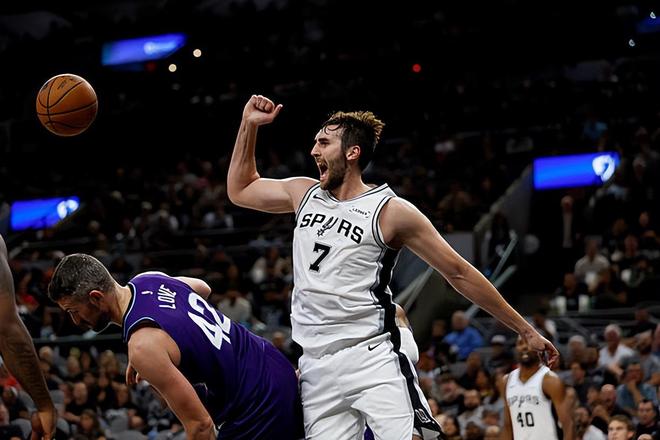 本场比赛中,马刺的内线新援卢克-科内特(Luke Kornet)的表现依然是保持在一个极高的水平。科内特全场出场18分16秒,投篮4中2,罚球4中3,得到了7分6篮板3助攻2盖帽的数据,还有1次失误和1次犯规,正负值更是达到了全队最高的+20。科内特在进攻端也是在对手内线制造了一定的威胁并且拿下了一些分数。不仅如此,他在传球和策应方面的能力也是依然非常可靠的。除此之外,科内特在防守端的表现同样是相当出色的,他在篮板保护、护框和内线防守方面的作用也是肉眼可见的。科内特的出场时间并不多,但是他也是将自己在攻防两端的才能都发挥了出来,他也是在球权和战术地位有限的情况下又一次证明了自己对于比赛的影响力。